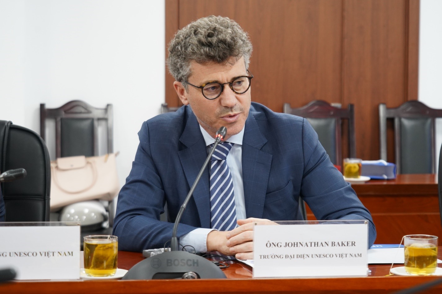 Ông Johnathan Baker, Trưởng đại diện Văn phòng UNESCO tại Việt Nam phát biểu tại buổi làm việc