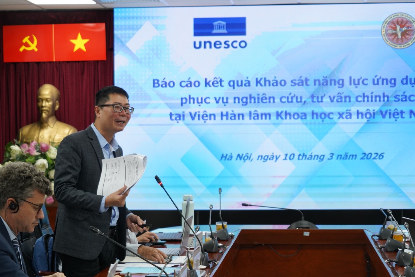 Chiều 10/3, tại Hà Nội, Viện Hàn lâm Khoa học xã hội Việt Nam (Viện Hàn lâm) phối hợp với UNESCO tổ chức buổi làm việc nghe báo cáo kết quả Khảo sát năng lực ứng dụng trí tuệ nhân tạo (AI) phục vụ nghiên cứu, tư vấn chính sách tại Viện Hàn lâm, do UNESCO tài trợ.